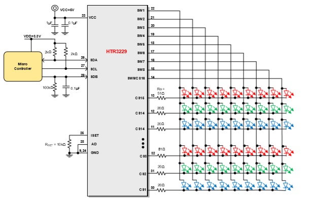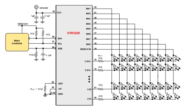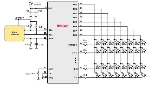 HTR3236是一款36路LED PWM驅(qū)動器,PWM頻率可固定為3kHz或22kHz。每一路最大輸出電流可通過外置電阻REXT調(diào)節(jié),最大38mA,并