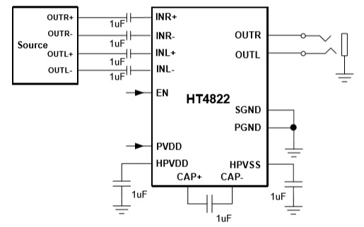 HT4822能在2.5V-6.0V電源條件下工作,具有過 熱保護(hù)和欠壓保護(hù)等功能。