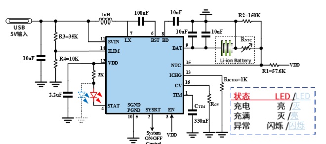 圖1. LGS55183 QFN版本典型應(yīng)用 1A充電(適應(yīng)4.5V USB;電池充電溫度為0℃~60℃;)
