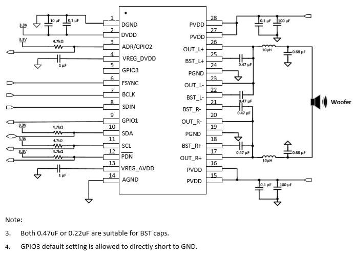 I2S數(shù)字輸入33W立體聲D類音頻功放芯片、內置DSP小音量低頻增強等算法 |