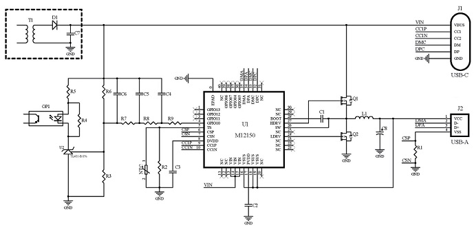 M12150是一款支持PD3.1的雙口全兼容快充協(xié)議IC,集成了微處理器、USB Type-C 接口、快充協(xié)議控制器、高精度電流采樣電阻,支持DFP/Source功能。利用TL431和光耦組成的反饋電路調(diào)整前級AC-DC的輸出電壓,搭載極少的元件可以組成C口協(xié)議調(diào)壓、A口降壓的 C+A獨(dú)立雙口功率可分配的快充解決方案。 |