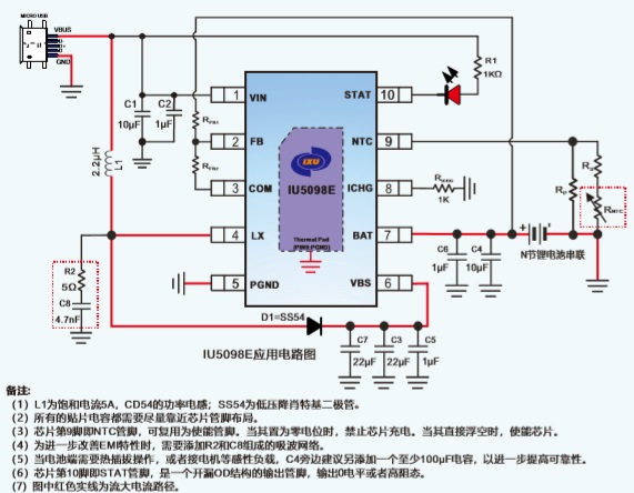 IU5098E是—款5V輸入,最大2A充電電流, 支持2-3節(jié)鋰離子電池/磷酸鐵鋰電池串聯(lián)應用的升壓充電管理IC。IU5098E集成功率MOS,采用異步開關架構 ,使其在應用時僅需極少的外圍器件,可有效減少整體方案尺寸,降低BOM成本。IU5098E的升壓開關充電轉換器的工作頻率為500KHz,轉換效率為90%。