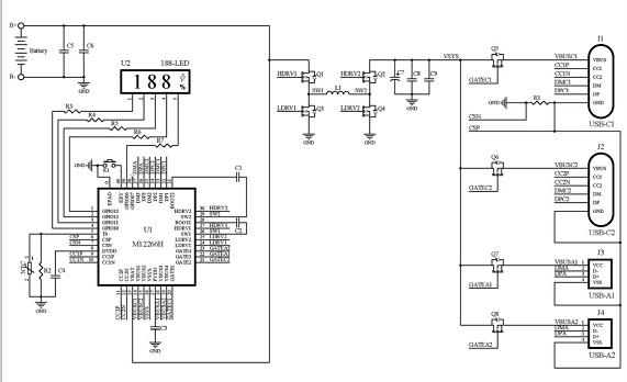 M12266H是一款面向多串電芯大功率移動(dòng)電源應(yīng)用的專用 SOC,集成了同步升降壓電壓變換器、電池充 放電管理模塊、顯示模塊、電量計(jì)算模塊,提供最大 100W 輸入/輸出功率,支持 PD3.0、QC3.0、AFC、FCP、SCP、BC1.2 DCP、UFCS 等主流快充協(xié)議,并提供輸入/輸出的過壓/欠壓、電池過壓、過充/過放、NTC 過溫、放電過流、輸出短路保護(hù)等完備的保護(hù)功能。配合極簡的外圍電路,即可組成100W 多口移動(dòng)電源。 |