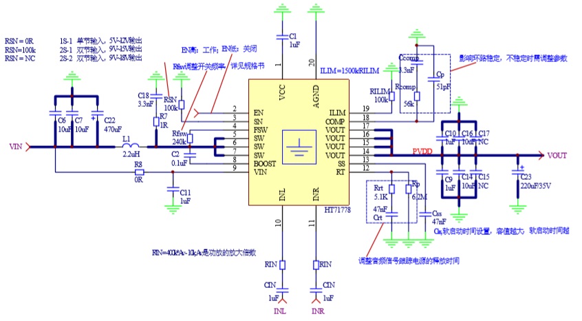 HT71778還支持可編程的軟啟動,以及可調(diào)節(jié)的開關(guān)峰值電流限制。 此外,該器件還提供有22V輸出過壓保護(hù)、 逐周期過流保護(hù)和熱關(guān)斷保護(hù)。