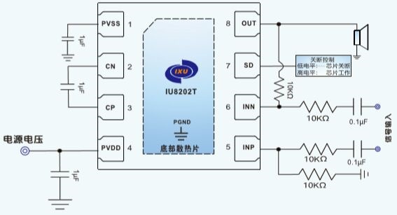 IU8202T采用單端模式輸出,其直驅(qū)模式結(jié)構(gòu)單電源供電時能夠產(chǎn)生以地為參考的輸出,從而省 去了大尺寸的隔直電容,既節(jié)省了成本和電路板空間, 也降低了元件的高度。