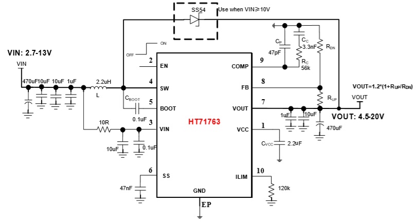 HT71763具有2.7V至20V寬輸入電壓范圍, 可為采用單節(jié)或兩節(jié)鋰電池的應用提供支持。該器件具備15A開關電流能力,并且能夠提供20V的輸出電壓。