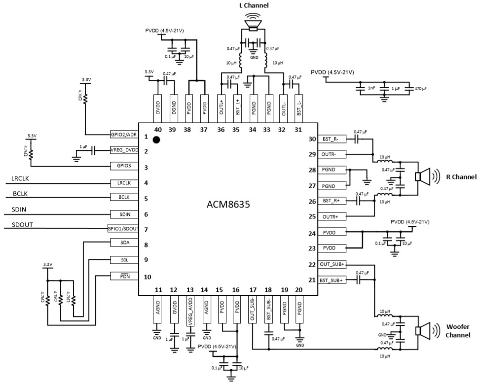 ACM8635一款2.1通道數(shù)字輸入音頻功率放大器。供電電壓范圍在4.5V-21V。在2.1通道工作模式, 2 x 6歐+4歐負(fù)載下,輸出功率可以達(dá)到2×24W+40W ; 在雙聲道工作模式,2x4歐負(fù)載下,輸出功率可以達(dá)到2×42W。