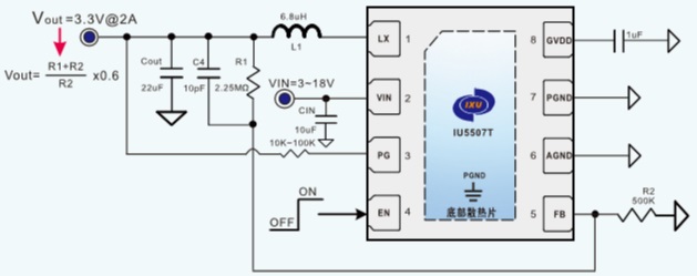 IU5507T是一款由基準(zhǔn)電壓源、振蕩電路、比較器、PWM/PFM控制電路等構(gòu)成的CMOS降壓DC/DC調(diào)整器。利用PWM/PFM自動切換控制電路達(dá)到可調(diào)占空比,具有全輸入電壓范圍(3V-18V)內(nèi)的低紋波、高效率和大輸出電流等特點(diǎn)。
