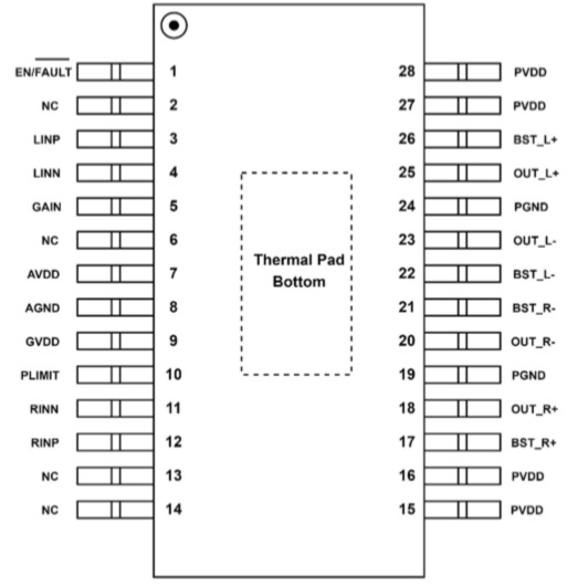- 超低靜態(tài)電流: <28mA, PVDD=12V, 輸出 LC =10uH+0.68uF