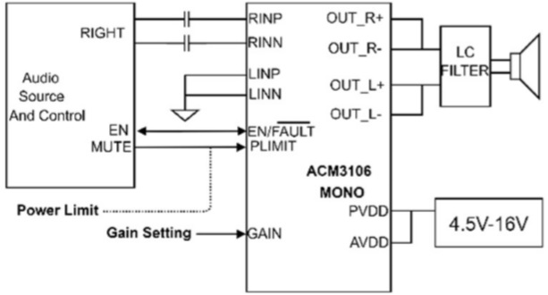 ACM3106 還提供全差分輸入,pop 音抑制,提供兩種增益 (26dB and 36dB)選擇功能。提供可調(diào)節(jié)的輸出功率限制功能 和輸出直流檢測保護功能用于保護喇叭。 另有短路保護、 過熱保護和過壓/欠壓保護可防止器件在故障情況下受損。