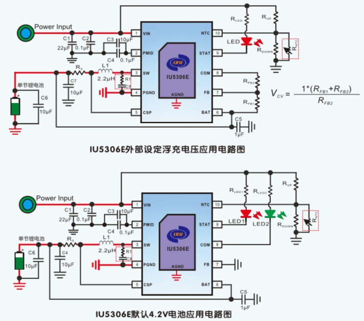 IU5306E通過調(diào)節(jié)電池外部反饋電阻分壓比例,得到不同的恒壓充電電壓值,從而適配不同規(guī)格的單節(jié)鋰電池。如果FB直接接地,則默認為4.2V的電池規(guī)格。IU5306E具有完善的保護功能,包括輸入欠壓/過壓保護、電池過壓和短路保護、電池溫度保護NTC功能、芯片溫度保護。此外芯片通過外接LED指示燈對充電過程實現(xiàn)全程監(jiān)控。