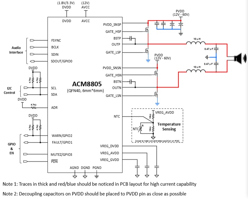 ACM8805是一款具有數(shù)字輸入的單通道D類音頻功放控制器,帶有5V柵極驅(qū)動(dòng)器,用于驅(qū)動(dòng)外部GaN HEMT或MOSFET。外圍應(yīng)用電路只需很少的元件就可在4.5V至80V的PVDD電源、3.3V或1.8V的DVDD電源下工作。