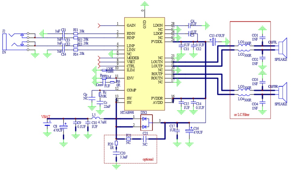 此外,HTA8998內(nèi)部集成免濾波器調(diào)制技術(shù), 能夠直接驅(qū)動(dòng)揚(yáng)聲器,內(nèi)置的關(guān)斷功能使待機(jī)電流最小化,還集成了輸出端過流保護(hù)、片內(nèi)過溫保護(hù)、輸入電源欠壓異常保護(hù)、升壓電壓過壓保護(hù)等功能。