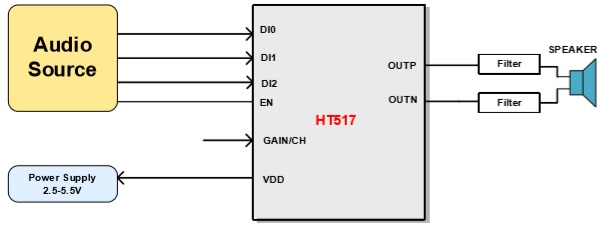 HT517集成的D類音頻功放還具有增益可調(diào)、擴(kuò)頻等功能。