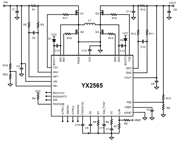 它支持高達65V的寬輸入和輸出電壓范圍,可在降壓、升壓和降壓-升壓模式之間無縫轉(zhuǎn)換。此外,它還支持雙向工作。YX2565集成了具有欠壓鎖定 (UVLO)保護的高壓側(cè)和低壓側(cè)柵極驅(qū)動器。 它提供可編程的電感器峰值電流限制和輸入/輸出 電流限制功能,以及通過ISMON1和ISMON2進行實時輸出電流監(jiān)控。CC/CV(恒流/恒壓)調(diào)節(jié)功能使其適用于電池充電系統(tǒng)。此外,YX2565 還包括一個外部可編程電池充電定時配置。