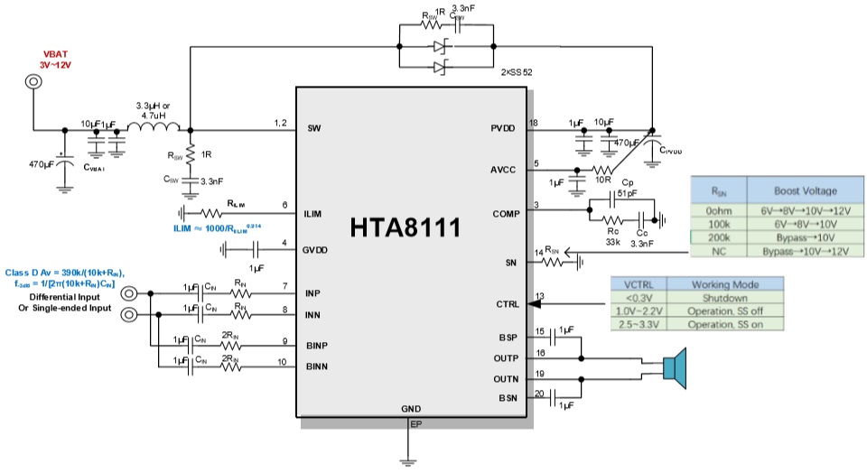 HTA8111內(nèi)置可動態(tài)調(diào)節(jié)的升壓,可以提供一個適應不同輸出功率的電壓給D類功放,其可大幅提高系統(tǒng)效率,延長電池續(xù)航時間。