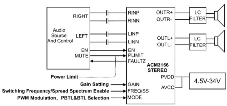 ACM3156工作電壓范圍在 4.5-34V,輸出配置可以立體聲BTL,也可以單通道PBTL。
